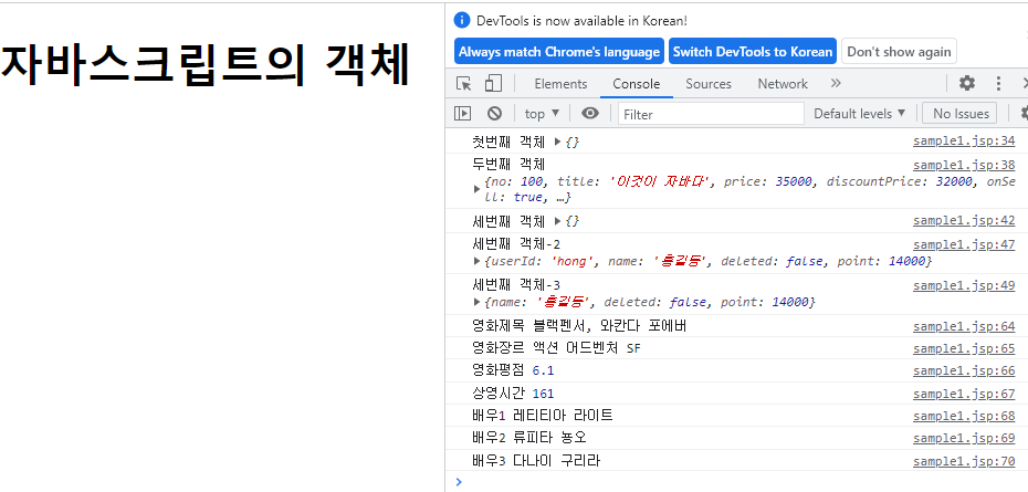 obj.price = 32000; // obj -> {no:100, title:"이것이 자바다", price:32000}이 되었다.<title>자바스크립트의 객체</title> </head> <body> <h1>자바스크립트의 객체</h1> <script type="text/javascript"> // 빈 객체 생성하기 var obj = {}; console.log("첫번째 객체", obj); // 구성요소를 포함하고 있는 객체 생성하기 var obj2 = {no:100, title:"이것이 자바다", price:35000, discountPrice:32000, onSell:true, stock:30}; console.log("두번째 객체", obj2); // 객체를 생성하고, 구성요소 추가/삭제하기 var obj3 = {}; console.log("세번째 객체", obj3); obj3.userId='hong'; obj3.name="홍길동"; obj3.deleted = false; obj3.point = 14000; console.log("세번째 객체-2", obj3); delete obj3.userId; console.log("세번째 객체-3", obj3); // 다양한 값을 포함하는 객체 var obj4 = { name: "블랙펜서, 와칸다 포에버", // 값: 문자열 genre: ['액션', '어드벤처', 'SF'], // 값: 배열 score: 6.1, // 값: 숫자(실수) runningTime: 161, // 값: 숫자(정수) act: [ // 값: 배열 {name:"레티티아 라이트", role:"슈리역", engName:"Letitia Wright"}, // 각 배열의 값: 객체다. {name:"류피타 뇽오", role:"나키아 역", engName:"Lupita Myoung'o"}, {name:"다나이 구리라", role:"오코예 역", engName:"Danai Gurira"} ] } // 객체의 프로퍼티값 출력 console.log("영화제목", obj4.name); console.log("영화장르", obj4.genre[0], obj4.genre[1], obj4.genre[2]); console.log("영화평점", obj4.score); console.log("상영시간", obj4.runningTime); console.log("배우1", obj4.act[0].name) console.log("배우2", obj4.act[1].name) console.log("배우3", obj4.act[2].name) </script> </body>