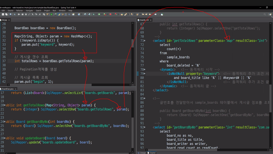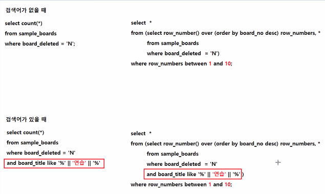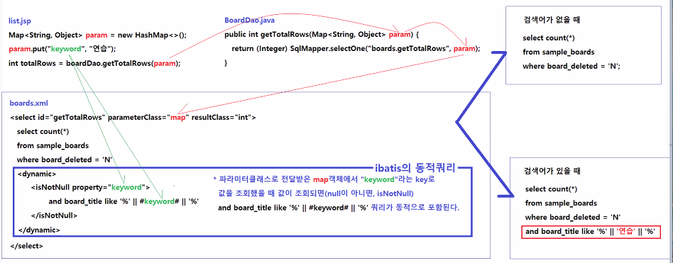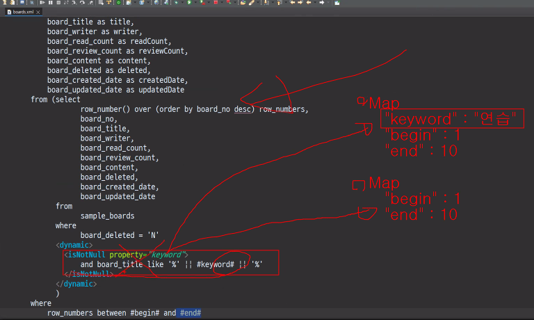 * 파라미터클래스로 전달받은 map객체에서 "keyword"라는 key로 값을 조회했을 때 값이 조회되면 (null이 아니면, isNotNull) and board_title like '%' || #keyword# || '%' 쿼리가 동적으로 포함된다.