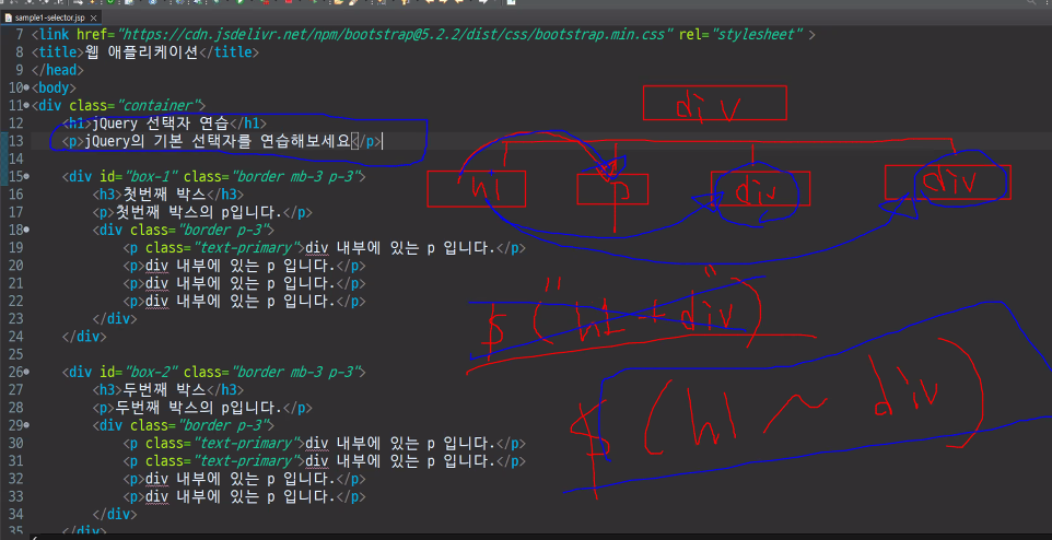 <title>웹 애플리케이션</title> </head> <body> <div class="container"> <h1>jQuery 선택자 연습</h1> <p>jQuery의 기본 선택자를 연습해보세요</p> <div id="box-1" class="border mb-3 p-3"> <h3>첫번째 박스</h3> <p>첫번째 박스의 p입니다.</p> <div class="border p-3"> <p class="text-primary">div 내부에 있는 p입니다.</p> <p>div 내부에 있는 p입니다.</p> <p>div 내부에 있는 p입니다.</p> <p>div 내부에 있는 p입니다.</p> <p>div 내부에 있는 p입니다.</p> </div> </div> <div id="box-2" class="border mb-3 p-3"> <h3>두번째 박스</h3> <p>두번째 박스의 p입니다.</p> <div class="border p-3"> <p class="text-primary">div 내부에 있는 p입니다.</p> <p class="text-primary">div 내부에 있는 p입니다.</p> <p>div 내부에 있는 p입니다.</p> <p>div 내부에 있는 p입니다.</p> <p>div 내부에 있는 p입니다.</p> <p>div 내부에 있는 p입니다.</p> </div> </div> </div> <script src="https://cdn.jsdelivr.net/npm/bootstrap@5.2.2/dist/js/bootstrap.bundle.min.js"></script> <script src="https://ajax.googleapis.com/ajax/libs/jquery/3.6.1/jquery.min.js"></script> <script type="text/javascript"> $(function() { // 태그 선택자 //$("h1").css("color", "red"); //$("h3").css("color", "green"); //$("p").css("color", 'blue'); // 클래스 선택자 //$(".text-primary").addClass("bg-danger"); // 아이디 선택자 //$("#box-1").css("background-color", "lightgray"); //$("#box-2").css("background-color", "lightgreen"); //$("h1, h3").css("color", 'red'); //$("h1, h3, .text-primary").css("background-color", "lightgreen"); // 자손 선택자 $("#box-1 p").css("background-color", "lightgreen"); // 자식 선택자 $("#box-2 > p").css("background-color", "lightgreen"); // 자식 선택자 $("#box-2 > div > p").css("background-color", "orange"); // 형제 선택자 (+ 바로 다음 동생 선택자, h1바로 다음에 있는 div) //$("h1 + div").css("background-color", "orange"); // 형제 선택자 (~ 동생들 선택자, h1바로 다음에 있는 div) //$("h1 ~ div").css("background-color", "orange"); }); </script> </body> </html>