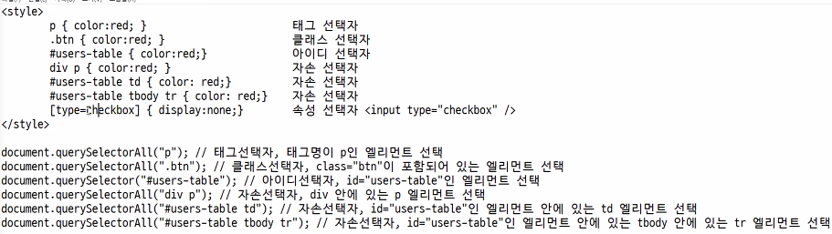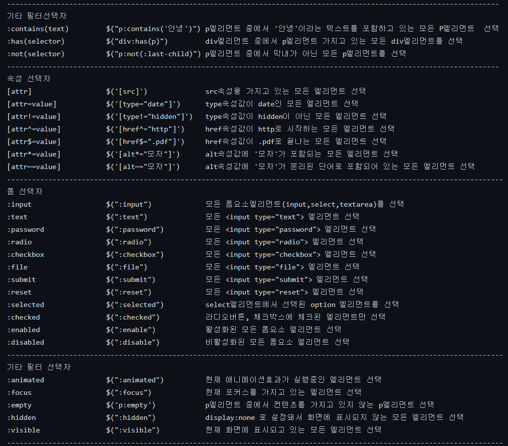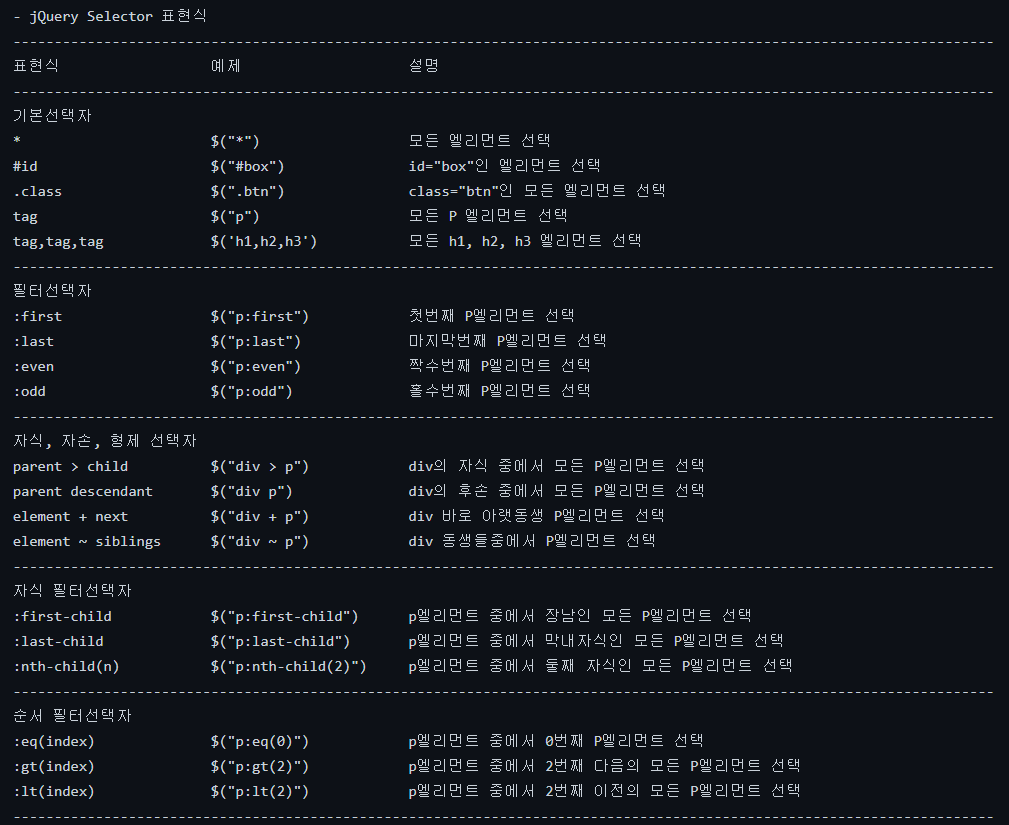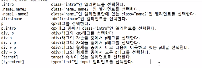 - CSS3 선택자를 지원 (자바스크립트 안에서도 내가 조작하고 싶은 엘리먼트를 조회할 때에도 사용한다. document.querySelectorAll(" ");)