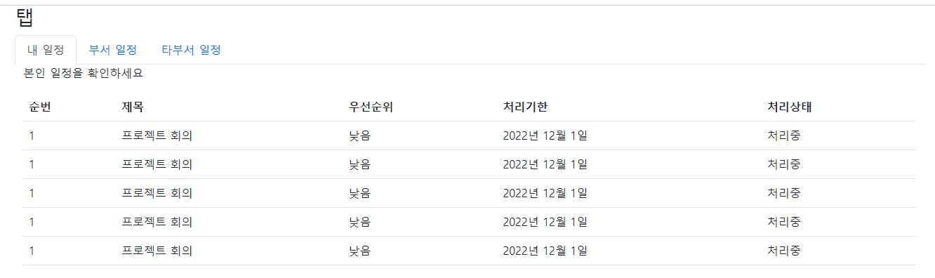 <title>웹 애플리케이션</title> </head> <body> <div class="container"> <div class="row mb-3"> <div class="col-12"> <h3>탭</h3> <ul class="nav nav-tabs"> <li class="nav-item"> <a class="nav-link active" data-bs-toggle="tab" href="#menu-1">내 일정</a> </li> <li class="nav-item"> <a class="nav-link" data-bs-toggle="tab" href="#menu-2">부서 일정</a> </li> <li class="nav-item"> <a class="nav-link" data-bs-toggle="tab" href="#menu-3">타부서 일정</a> </li> </ul> <div class="tab-content"> <div class="tab-pane container active" id="menu-1"> <p>본인 일정을 확인하세요</p> <table class="table"> <thead> <tr> <th>순번</th> <th>제목</th> <th>우선순위</th> <th>처리기한</th> <th>처리상태</th> </tr> </thead> <tbody> <tr> <td>1</td> <td>프로젝트 회의</td> <td>낮음</td> <td>2022년 12월 1일</td> <td>처리중</td> </tr> <tr> <td>1</td> <td>프로젝트 회의</td> <td>낮음</td> <td>2022년 12월 1일</td> <td>처리중</td> </tr> <tr> <td>1</td> <td>프로젝트 회의</td> <td>낮음</td> <td>2022년 12월 1일</td> <td>처리중</td> </tr> <tr> <td>1</td> <td>프로젝트 회의</td> <td>낮음</td> <td>2022년 12월 1일</td> <td>처리중</td> </tr> <tr> <td>1</td> <td>프로젝트 회의</td> <td>낮음</td> <td>2022년 12월 1일</td> <td>처리중</td> </tr> </tbody> </table> </div> <div class="tab-pane container fade" id="menu-2"> <p>소속 부서의 일정을 확인하세요</p> </div> <div class="tab-pane container fade" id="menu-3"> <p>다른 부서의 일정을 확인하세요</p> </div> </div> </div> </div> </div> <script src="https://cdn.jsdelivr.net/npm/bootstrap@5.2.2/dist/js/bootstrap.bundle.min.js"></script> <script src="https://ajax.googleapis.com/ajax/libs/jquery/3.6.1/jquery.min.js"></script> </body> </html>