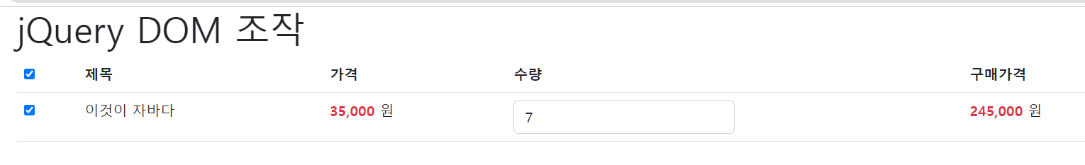 <div class="container"> <h1>jQuery DOM 조작</h1> <table class="table"> <thead> <tr> <th><input type="checkbox" id="checkbox-all" checked></th> <th>제목</th> <th>가격</th> <th>수량</th> <th>구매가격</th> </tr> </thead> </tbody> <tr> <td><input type="checkbox" name="bookNo" value="100" checked/></td> <td>이것이 자바다</td> <td><strong class="text-danger" id="book-price">35,000</strong> 원</td> <td><input type="number" class="form-control w-50" id="book-amount" name="amount" value="1"/></td> <td><strong class="text-danger" id="book-order-price">35,000</strong> 원</td> </tr> </table> </div> <script src="https://cdn.jsdelivr.net/npm/bootstrap@5.2.2/dist/js/bootstrap.bundle.min.js"></script> <script src="https://ajax.googleapis.com/ajax/libs/jquery/3.6.1/jquery.min.js"></script> <script type="text/javascript"> $(function(){ /* $("#book-amount").change(function() { // 가격, 현재수량 var price = $("#book-price").text().replace(",", ""); // <strong>35,000</strong> 태그사이의 컨텐츠 조회 var amount = $("#book-amount").val(); // <input type="number" value="1"> 입력요소의 값 조회 // 구매가격 계산 var orderPrice = price*amount; // new Number(숫자).toLocaleString() : 숫자를 3자리마다 ","가 포함된 텍스트로 반환한다. var currencyOrderPrice = new Number(orderPrice).toLocaleString(); // 구매가격을 태그의 컨텐츠로 변경 $("#book-order-price").text(currencyOrderPrice); // <strong>35,000</strong> 태그 사이의 컨텐츠 변경 }) */ // 동시에 여러 개의 이벤트에 대한 이벤트 핸들러 함수 등록하기 $("#book-amount").on('change keyup', function() { // 가격, 현재수량 var price = $("#book-price").text().replace(",", ""); //<strong>35,000</strong> 태그사이의 컨텐츠 조회이므로 .text() var amount = $("#book-amount").val(); // <input type="number" value="1"> 입력요소의 값 조회이므로 .val()를 사용한다. // 구매가격 계산 var orderPrice = price*amount; // new Number(숫자).toLocaleString() : 숫자를 3자리마다 ","가 포함된 텍스트로 반환한다. var currencyOrderPrice = new Number(orderPrice).toLocaleString(); // 구매가격을 태그의 컨텐츠로 변경 $("#book-order-price").text(currencyOrderPrice); // <strong>35,000</strong> 태그 사이의 컨텐츠 변경 }) }) </script> </body> </html>