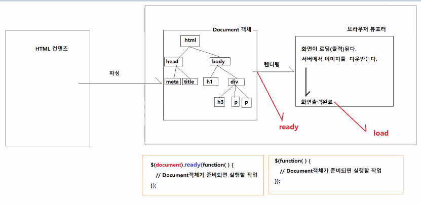 HTML 컨텐츠를 응답으로 받아서 파싱해서 document 객체를 생성되고, document객체가 준비되면 ready 라는 이벤트가 발생하도록 jQuery에서 사용자정의 이벤트를 만들었다.