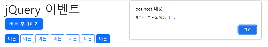 <div class="container"> <h1>jQuery 이벤트</h1> <div class="mb-3"> <button class="btn btn-primary" id="btn-add">버튼 추가하기</button> </div> <div id="button-box"> <button class="btn btn-primary btn-sm">버튼</button> </div> </div> <script src="https://cdn.jsdelivr.net/npm/bootstrap@5.2.2/dist/js/bootstrap.bundle.min.js"></script> <script src="https://ajax.googleapis.com/ajax/libs/jquery/3.6.1/jquery.min.js"></script> <script type="text/javascript"> $("#btn-add").click(function() { var htmlContent = ' <button class="btn btn-outline-primary btn-sm">버튼</button>'; // .append(html컨텐츠)는 선택된 엘리먼트 안에 html컨텐츠를 추가한다. $("#button-box").append(htmlContent); }); /* <div id="button-box"></div> 엘리먼트 안에 현재 존재하거나, 미래에 추가될 버튼에서 클릭이벤트가 발생했을 때 실행할 이벤트 핸들러 등록하기 // <div id="button-box"></div> 엘리먼트 안에 현재 존재하는 버튼에만 이벤트 핸들러가 등록된다. $('#button-box button').click(function() { alert("버튼이 클릭되었습니다."); }) // #button-box 엘리먼트 안에 현재 존재하거나 미래에 추가되는 button엘리먼트에서 click 이벤트가 발생했을 때 실행할 이벤트 핸들러 등록하기 $("#button-box").on("click", 'button', function() { }) */ // <div id="button-box"></div> 엘리먼트 안에 현재 존재하거나, 미래에 추가될 버튼에서 클릭이벤트가 발생했을 때 실행할 이벤트 핸들러 등록하기 $("#button-box").on('click', 'button', function() { alert("버튼이 클릭되었습니다."); }); </script> </body> </html>