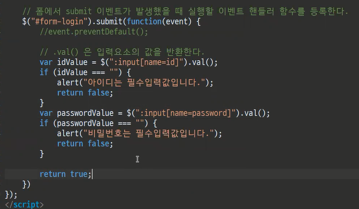 * submit(cb) 폼엘리먼트의 입력값들이 서버로 제출될 때 콜백 실행