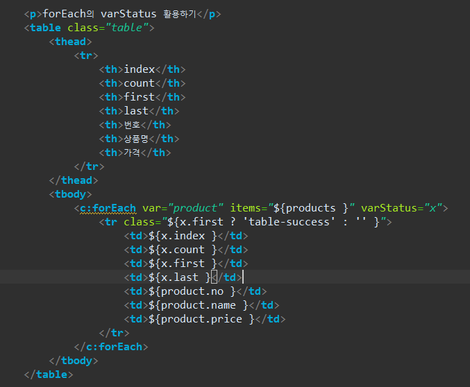 <c:forEach var="변수명1" items="${표현식}" varStatus="변수명2"> <p>${변수명2.count} ${변수명1}<p> </c:forEach>- varStatus에 지정된 변수에는 현재 반복상태정보를 담고 있는 객체가 전달된다.