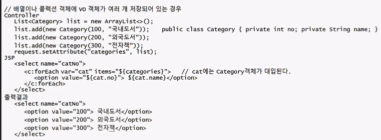 public class CoreController implements Controller { @Override public String execute(HttpServletRequest request, HttpServletResponse response) throws Exception { request.setAttribute("content1", "안녕하세요"); request.setAttribute("content2", "<button>버튼</button>"); request.setAttribute("score", 70); HttpSession session = request.getSession(); session.setAttribute("LOGIN_USER_ID", "hong"); Product product = new Product(100, "맥북 프로", "애플", 2500000, 2450000, 3); request.setAttribute("goods", product); String[] names = {"홍길동", "김유신", "강감찬", "이순신"}; List<String> menus = new ArrayList<>(); menus.add("아메리카노"); menus.add("바닐라 라떼"); menus.add("카페 모카"); menus.add("에스프레소"); menus.add("카라멜 마끼아또"); request.setAttribute("names", names); request.setAttribute("menus", menus); List<Category> categories = new ArrayList<>(); categories.add(new Category(100, "국내도서")); categories.add(new Category(200, "외국도서")); categories.add(new Category(300, "전자책")); categories.add(new Category(400, "음반/CD")); request.setAttribute("categories", categories); // 보통 이름을 같게 한다. List<Product> products = new ArrayList<>(); products.add(new Product(100, "맥북 프로", "애플", 250, 245, 10)); products.add(new Product(101, "맥북 에어", "애플", 250, 245, 10)); products.add(new Product(102, "레노버 싱크패드", "레노버", 280, 255, 10)); products.add(new Product(103, "아수스 게이밍 노트북", "아수스", 450, 445, 10)); products.add(new Product(104, "LG 그램 울트라", "LG", 350, 245, 10)); products.add(new Product(105, "맥프로", "애플", 650, 600, 10)); request.setAttribute("products", products); List<Map<String, Object>> list = List.of( Map.of("no", 100, "title", "이것이 자바다", "price", 35000), Map.of("no", 200, "title", "자바의 정석", "price", 30000), Map.of("no", 300, "title", "혼자서 공부하는 자바", "price", 37000) ); request.setAttribute("books", list); return "core.jsp"; } }List.of 리스트에 항목을 추가할 때,