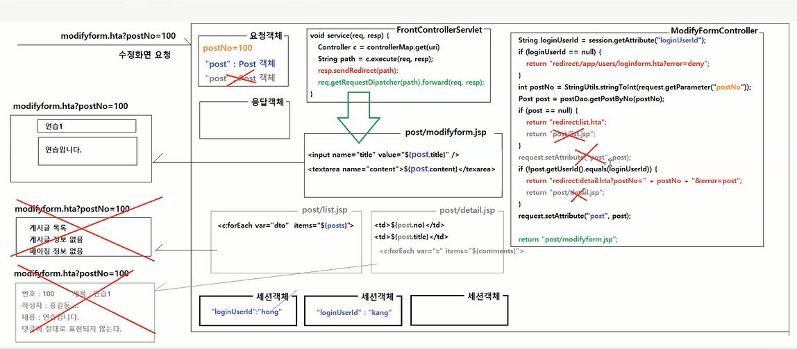 - 요청객체는 응답이 완료되기 전까지는 FrontController, Controller, jsp에서 접근할 수 있다.