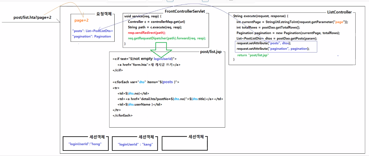 - 요청객체의 속성으로 가져온 건 진한 파란색, 요청객체의 요청파라미터로 가져온 건 노란색
