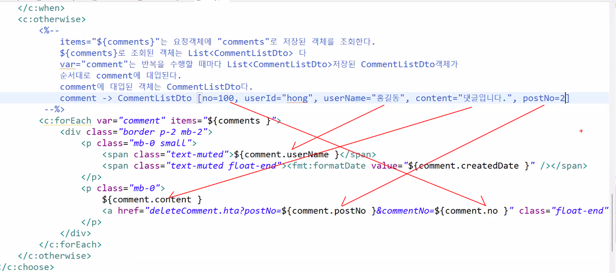 detail.jsp도 마찬가지로 댓글 조회하는 코드가 있을텐데 요청객체에 댓글이 없기 때문에 댓글이 나오지 않는 문제가 발생한다.