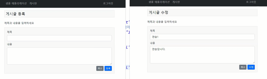 - 게시글 등록이나 수정이나 화면은 같지만