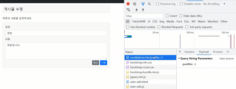 수정 : title, content + postNo 글번호가 추가되어서 간다.