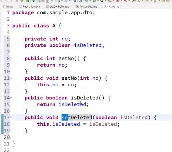 - boolean은 getter메소드 만들 때 get이 아닌 is-로 나타남, is가 getter의 역할을 한다.