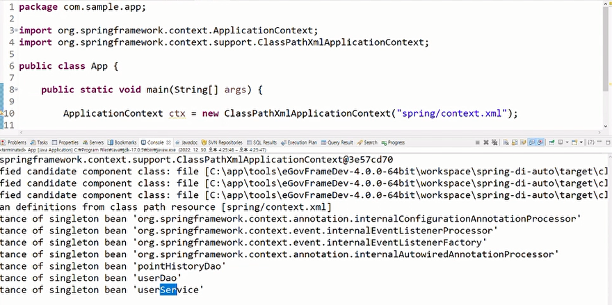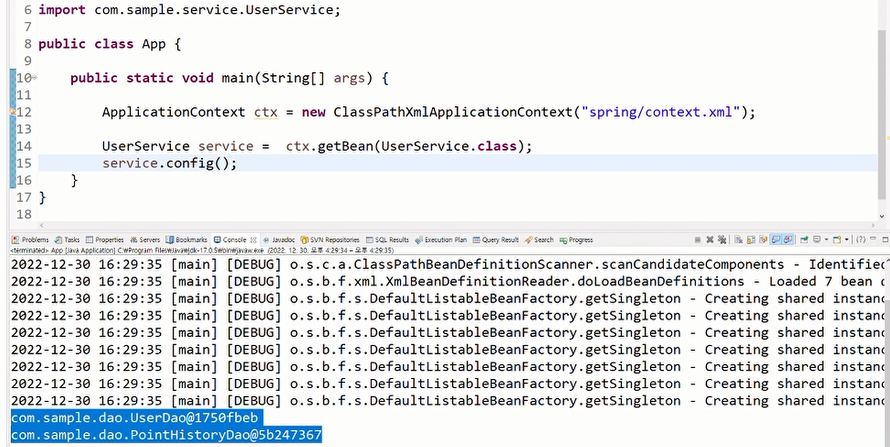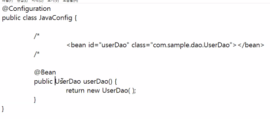 @Configuration - Java 기반 빈 설정을 담당하는 객체에 부착한다.package com.sample.service; import org.springframework.beans.factory.annotation.Autowired; import org.springframework.beans.factory.annotation.Value; import org.springframework.stereotype.Service; import com.sample.dao.PointHistoryDao; import com.sample.dao.UserDao; @Service public class UserService { @Autowired // setter메소드를 만들지 않아도 상관없음 private UserDao userDao; @Autowired private PointHistoryDao pointHistoryDao; @Value("${user.default.profile.filename}") private String filename; @Value("${user.discount.rate}") private double discountRate; public void config() { System.out.println(userDao); System.out.println(pointHistoryDao); System.out.println("고객의 기본 할인율: " + discountRate); System.out.println("고객의 기본 프로필이미지 파일명: " + filename); } }
