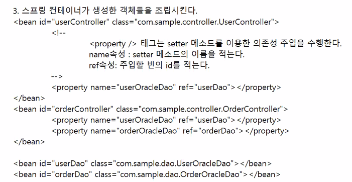 3. 스프링 컨테이너가 생성한 객체들을 조립시킨다.
