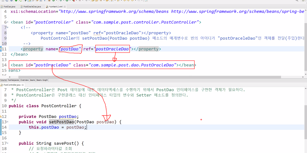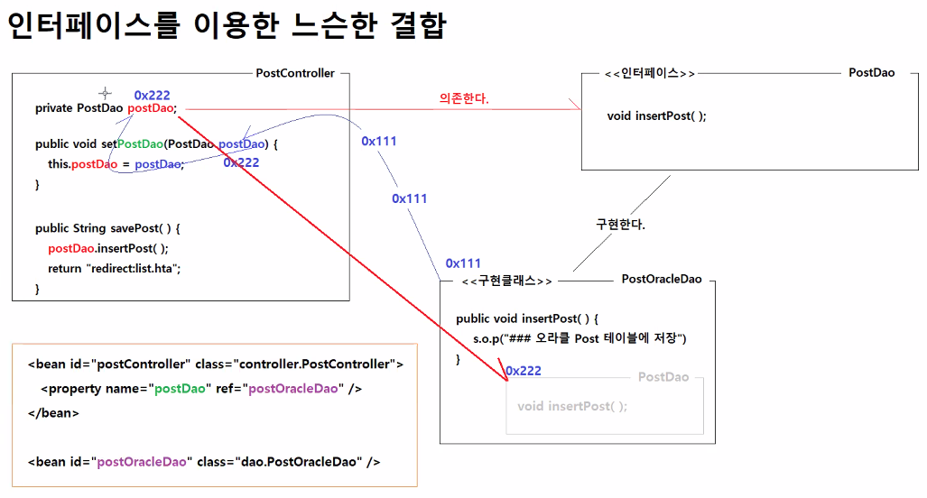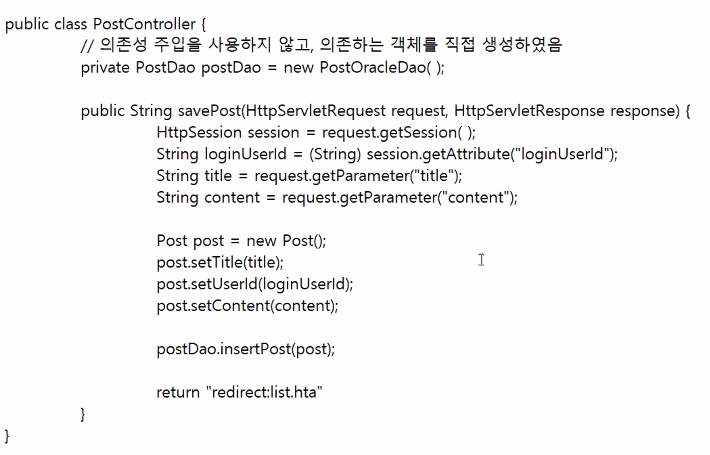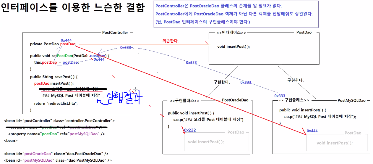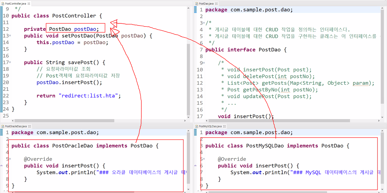 즉, PostController에게 PostOracleDao 객체가 아닌 다른 객체를 전달해줘도 상관없다.(단, PostDao 인터페이스의 구현클래스여야 한다.)