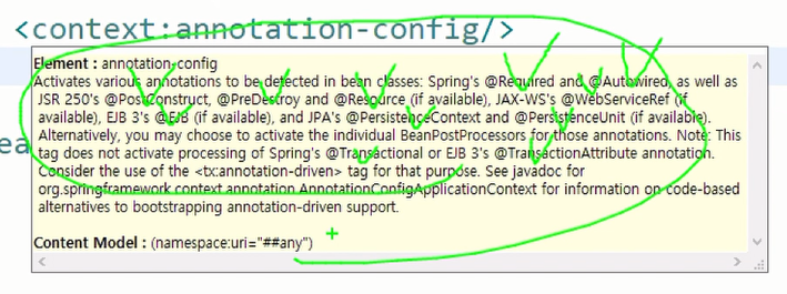 context.xml <?xml version="1.0" encoding="UTF-8"?> <beans xmlns="http://www.springframework.org/schema/beans" xmlns:xsi="http://www.w3.org/2001/XMLSchema-instance" xmlns:context="http://www.springframework.org/schema/context" xsi:schemaLocation="http://www.springframework.org/schema/beans http://www.springframework.org/schema/beans/spring-beans.xsd http://www.springframework.org/schema/context http://www.springframework.org/schema/context/spring-context-4.3.xsd"> <context:property-placeholder location="classpath:spring/app.properties"/> <context:annotation-config/> <context:component-scan base-package="com.sample"></context:component-scan> </beans><context:annotation-config />