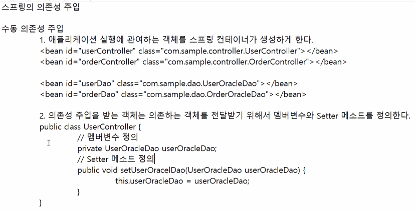 public void setUserDao(UserDao userDao) { // UserDao 타입의 객체 주입해야 한다.
