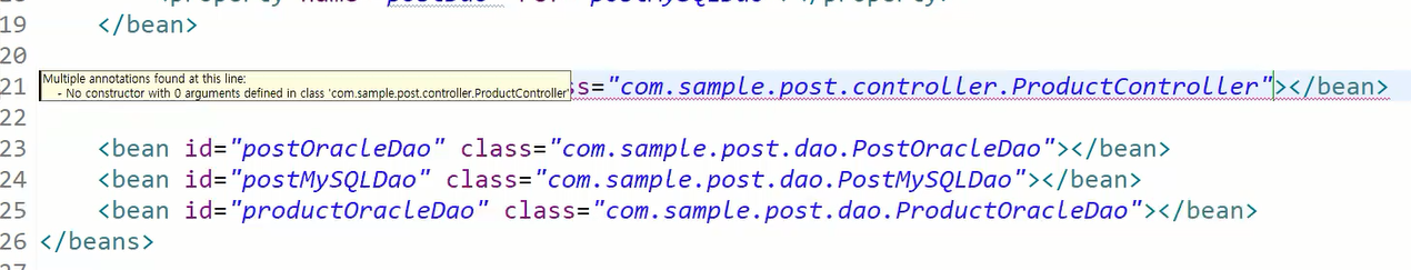 4. 단, 조사된 타입과 일치하거나 조사된 타입의 자식 객체가 2개 이상 발견되면 오류가 발생한다. (예: ProductDao는 없지만 구현한 ProductOracleDao, ProductMySQLDao가 있을 경우)