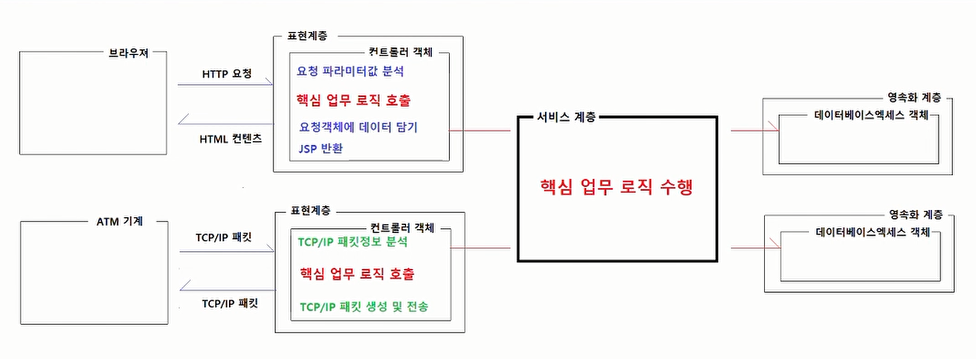 브라우저이든 ATM기계이든 요청방식이나 응답방식은 다르지만 업무로직은 같기 때문에 서비스계층을 따로 만들어서 재사용할 수 있게 한다.
