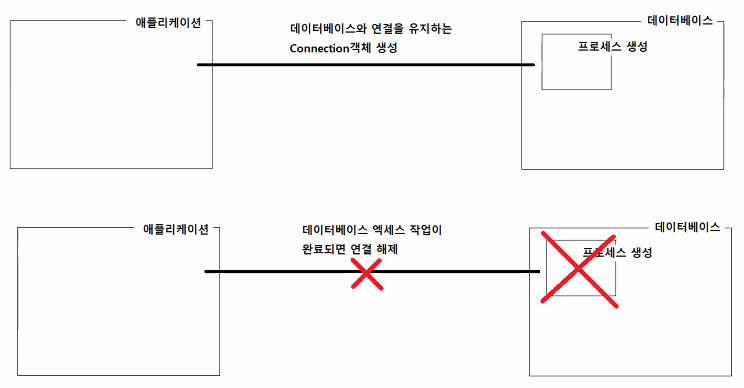 Connection연결을 하면 데이터베이스 내에서 DB 엑세스 작업을 지원하는 프로세스를 생성한다. 데이터베이스 엑세스 작업이 완료되면 프로세스도 제거된다.