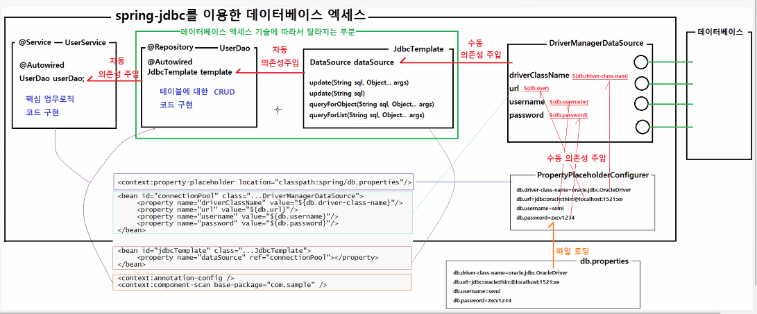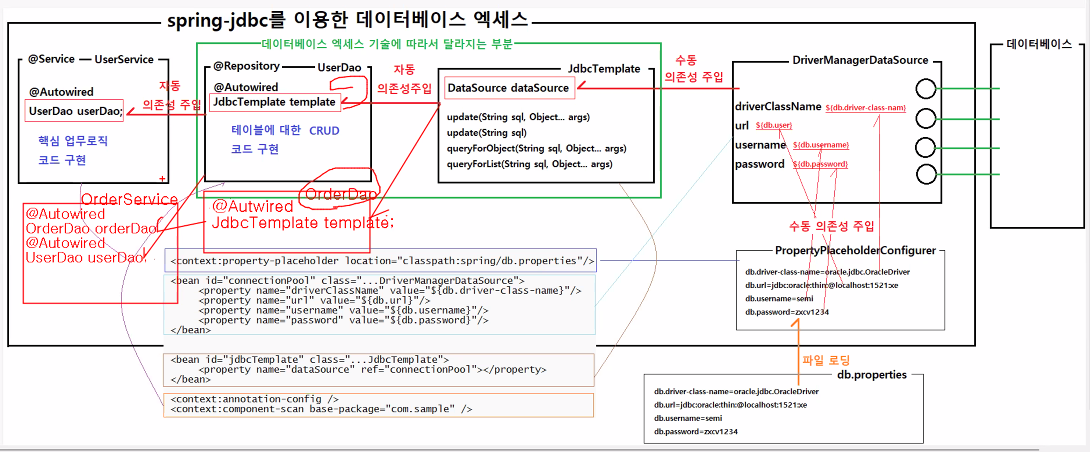 * 사용자정의 Dao 클래스는 jdbcTemplate객체를 의존성 주입받아서 데이터베이스 엑세스 작업을 수행한다.