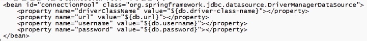 DriverManagerDataSource는 우리가 어떤 데이터베이스를 쓰는지 모르니까 어떤 계정이 있는지 모르니까 우리가 주입해줘야 한다. 따로 properties파일로 만들어둔다. setter메소드가 미리 만들어져 있다.
