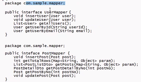 * 데이터베이스 엑세스 작업이 정의된 인터페이스다. (테이블당 하나씩 정의한다.)