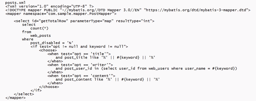 - dynamic 쿼리에서 <if>, <choose> ~ <when> ~ <otherwise>, <foreach> 태그를 사용해서 조건식처리, 반복처리가 가능해졌다.
