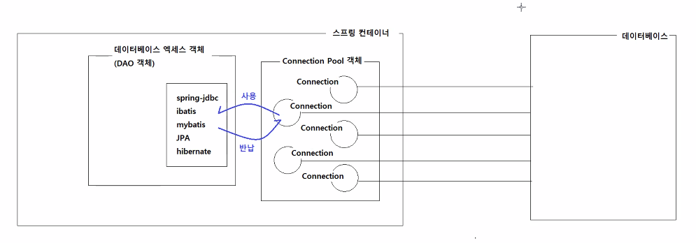 * 데이터베이스와 연결을 유지하는 Connection객체는 Connection Pool을 이용해서 획득하고, 사용 후 반납한다.
