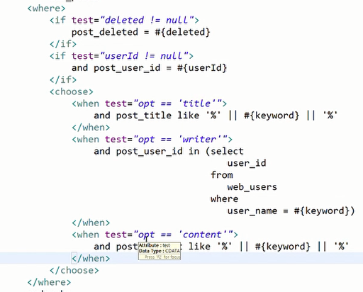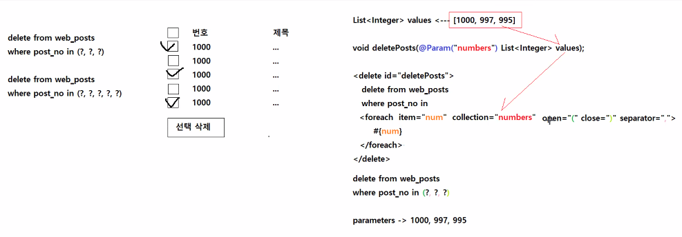 open="(" close=")" separator="," 뜻은 forEach문 전에는 (를 넣고 forEach문이 끝나면 )를 넣고 값들 사이에 , 를 넣으라는 의미이다.
