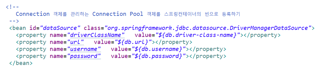 * dataSource는 mybatis가 데이터베이스 엑세스할 때 데이터베이스와 연결된 Connection객체를 제공하는 Connection Pool객체를 의존성 주입받는다.