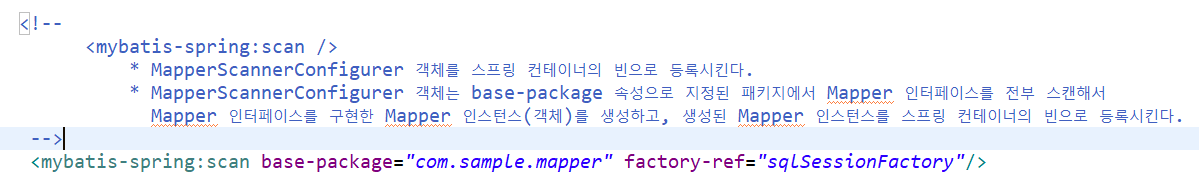 * <mybatis-spring:scan /> 태그는 MapperScannerConfigurer 객체를 스프링 컨테이너의 객체로 등록한다.