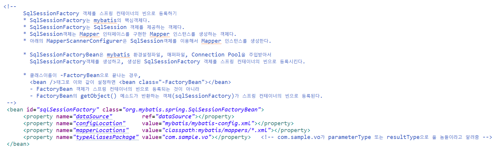 * SqlSessionFactoryBean 객체는 의존성 주입으로 전달은 dataSource, configLocation, mapperLications, typeAliasesPackage 등의 값을 이용해서 SqlSessionFactory객체를 생성하고, 스프링 컨테이너에 등록시킨다.