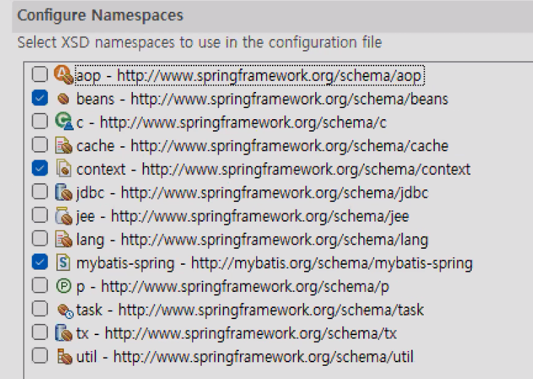 Namespace에서 beans하고 context하고 mybatis-spring 체크하기