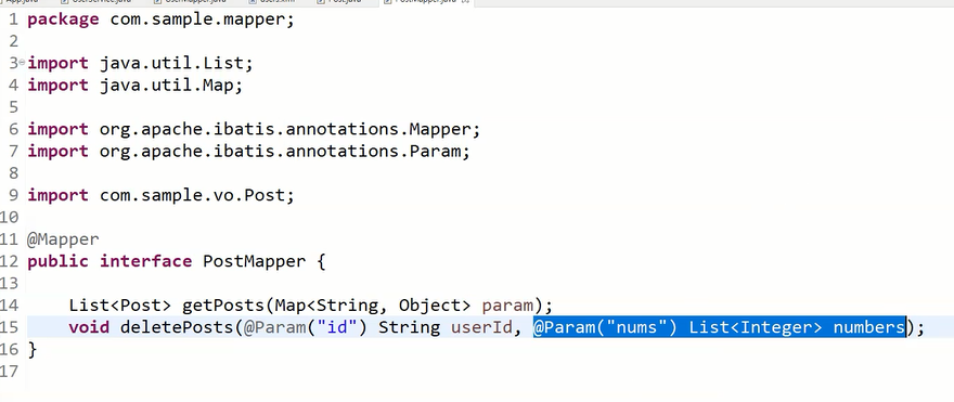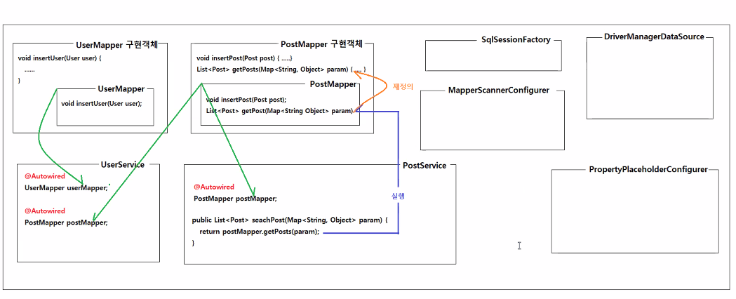 interface UserMapper, interface PostMapper, interface CommentMapper 등의 Mapper 인터페이스와 Mapper 파일이 각각 정의되어 있다면,