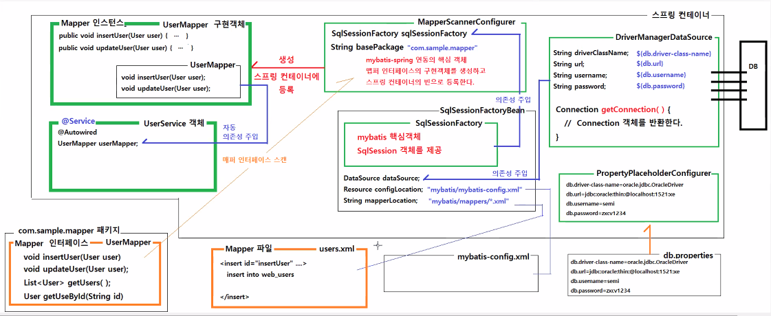 * mybatis-spring 라이브러리는 모든 Mapper인터페이스를 스캔해서 Mapper 인스턴스를 생성하고, 스프링 컨테이너의 빈으로 등록시키는 기능이 있기 때문에 UserMapper instance = session.getMapper(UserMapper.class); 이런코드를 하나씩 적지는 않는다.