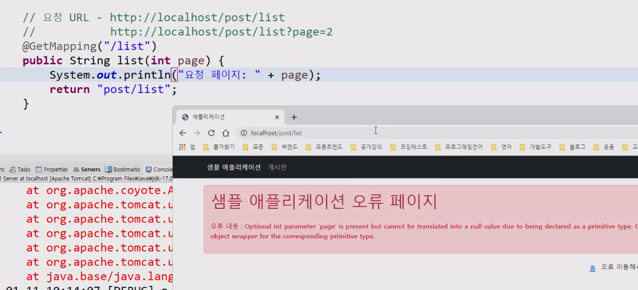 @RequestParam(name = "page", required = false, defaultValue = "1") int page 라고 적어주면 page가 없어도 기본값으로 문자 1이 int타입 1로 변환되어 대입된다.