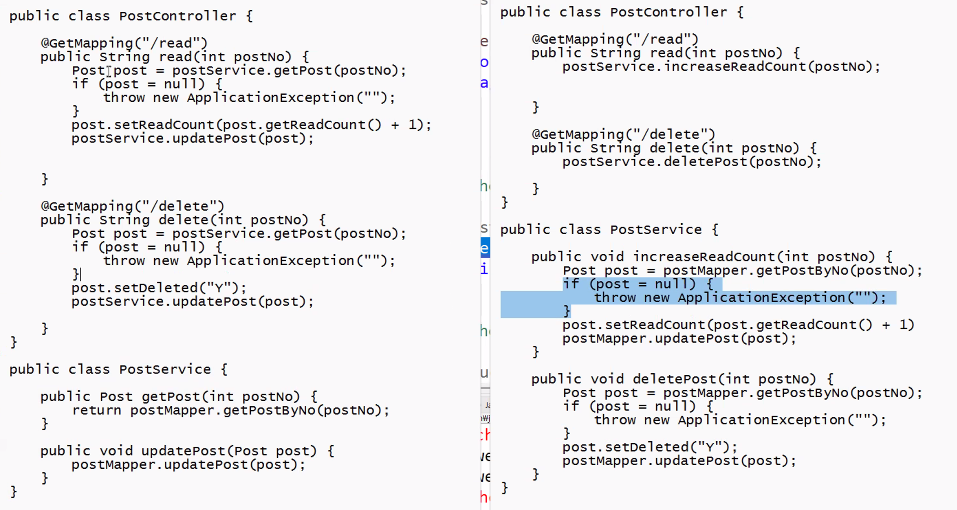 왼쪽보다는 오른쪽 코드가 좋다. 서비스에서 묵직하게 만들기.