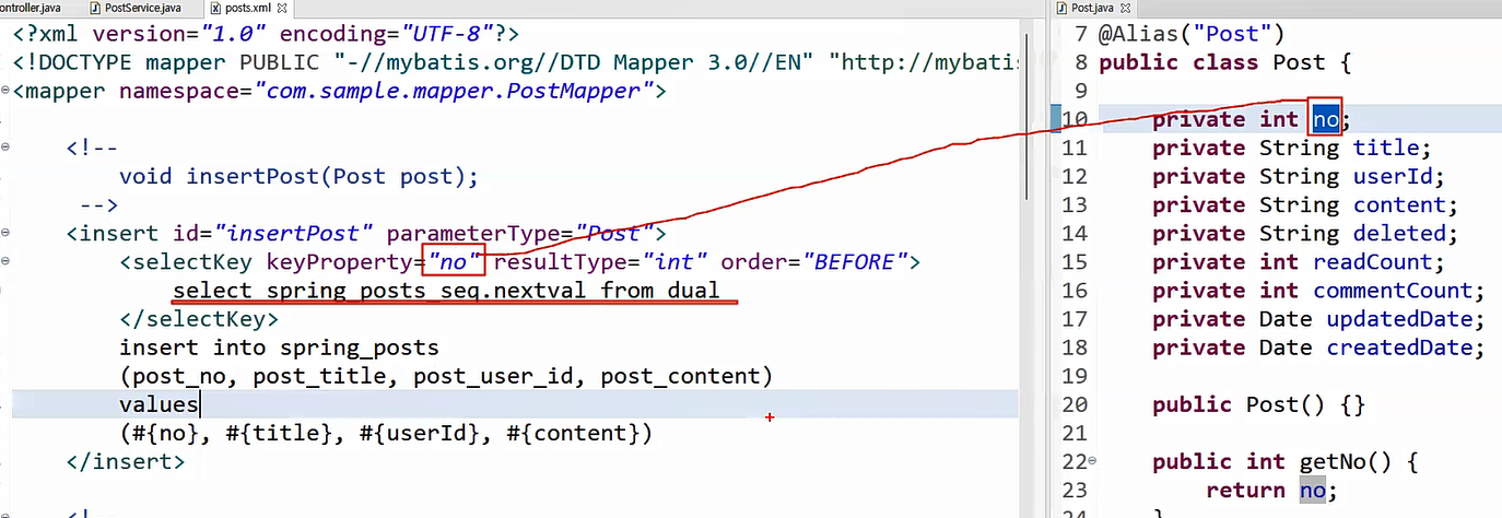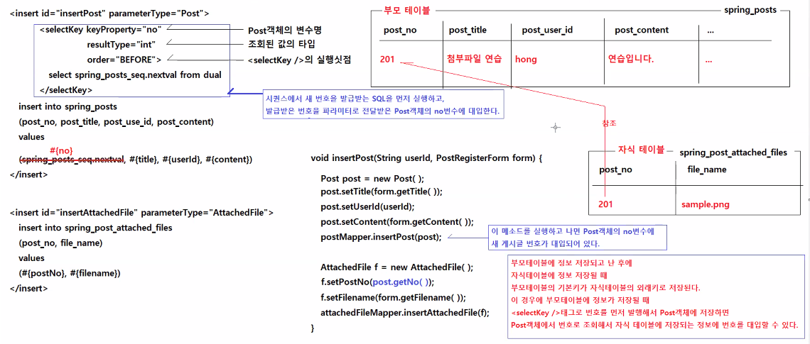 시퀀스번호를 얻는 쿼리를 별도로 만들지 않고, selectKey라는 태그를 메인쿼리 전에 작성하여 사용한다.