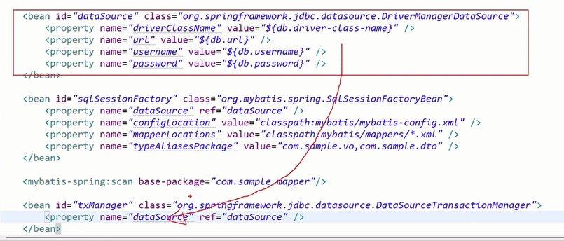 <property name="dataSource" ref="dataSource"/> // Connection Pool 객체를 의존성주입시킨다.