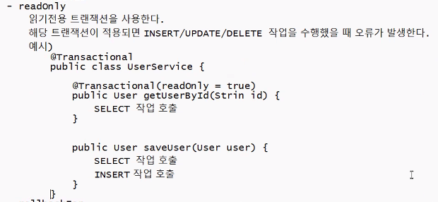 - spring framework는 선언적 트랜잭션 처리, 프로그래밍적 트랜잭션 처리를 지원한다. (프로그래밍적 트랜잭션 처리는 사용하지 않음)