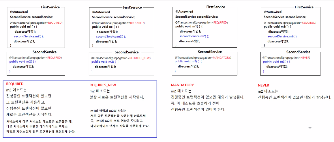 NESTED : m2 메소드는 내포된 트랜잭션을 시작한다.m2 메소드의 데이터베이스 엑세스 작업은 m1 메소드에서 진행중인 트랜잭션에 영향을 주지 않는다. m1 메소드의 데이터베이스 엑세스 작업은 m2 메소드에서 진행중인 내포된 트랜잭션에 영향을 준다.