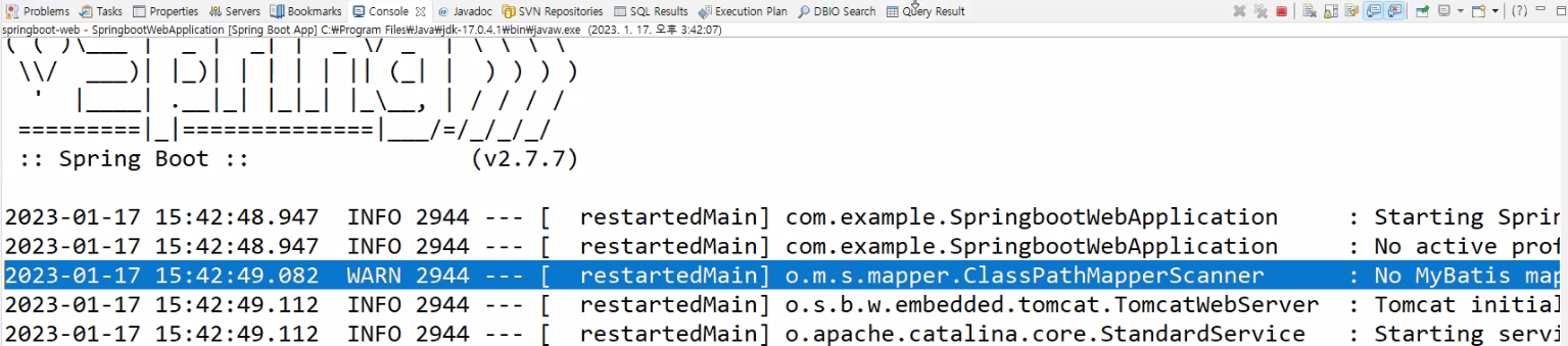 com.example.mapper 패키지의 UserMapper.java 클래스에 @Mapper 어노테이션만 붙여줘도 아까전에 나타났던 mybatis warning이 뜨지 않는다.