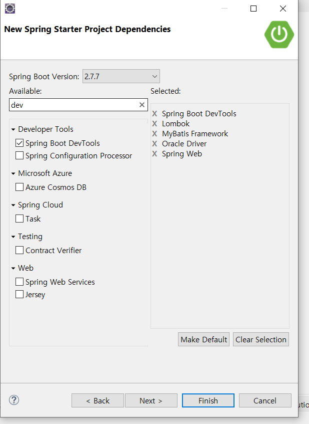 Project Dependency : 사용할 라이브러리 선택 (Spring Web, Oracle Driver, MyBatis Framework, Lombok, Spring Boot DevTools 선택)