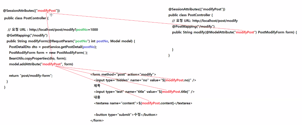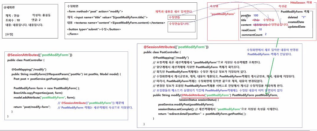 - 수정화면에서 새로 입력한 내용이 반영된 PostModifyForm 객체가 요청핸들러메소드에 전달된다.