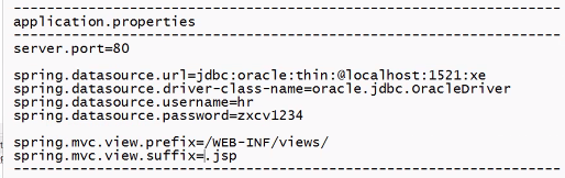 applictaion.properties의 설정 예 (spring.datasource.을 다 적어줘야 한다. yml과 달리 계층구조가 없어서)
