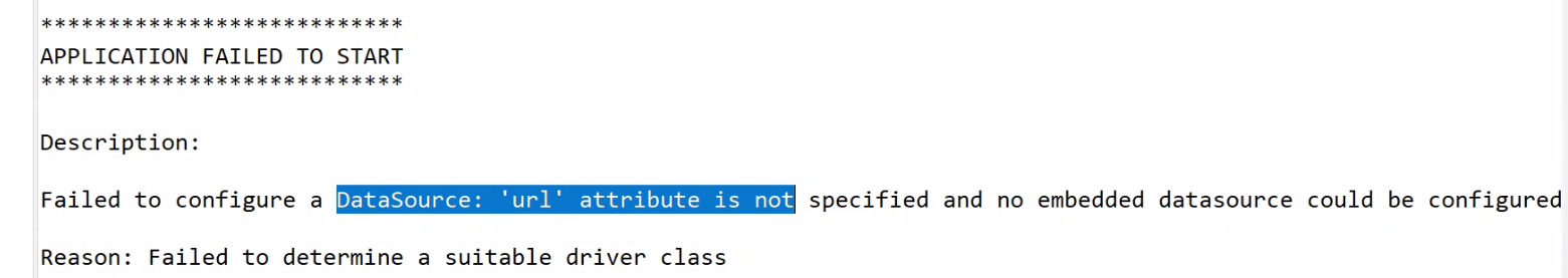 DataSource 'url'이 설정이 안되어있어 오류가 났음을 확인할 수 있다.