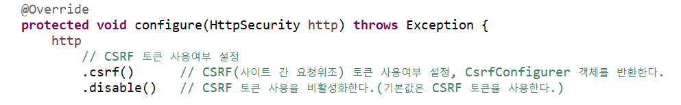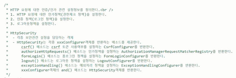 HttpSecurity객체를 매개변수로 받는 Configure메소드에는 다음과 같은 설정정보를 설정한다.