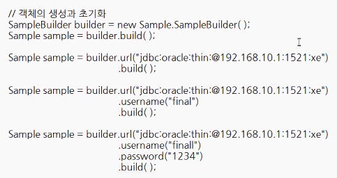 Sample sample = builder.url("jdbc:oracle:thin:@localhost:1521:xe") // return this;로 인해 SampleBuilder 자기자신이 반환된다.